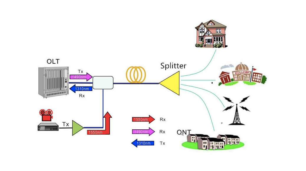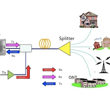 Topology: Point‑to‑multipoint, where one Optical Line Terminal (OLT) serves multiple Optical Network Units (ONUs) or Terminals (ONTs) via a passive Optical Distribution Network (ODN).